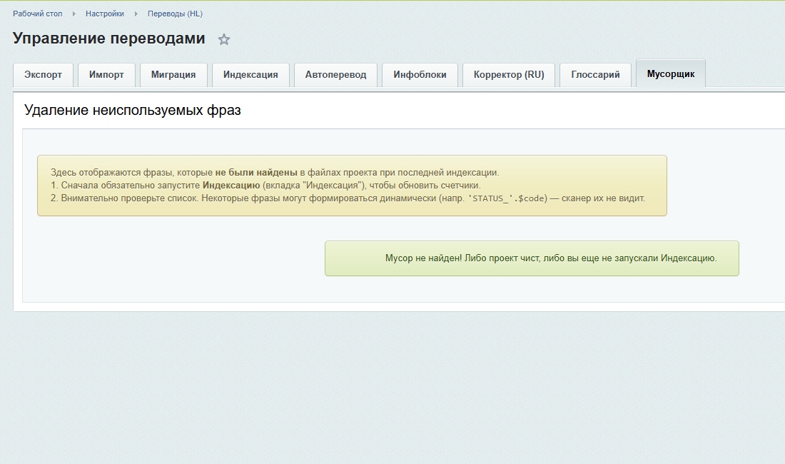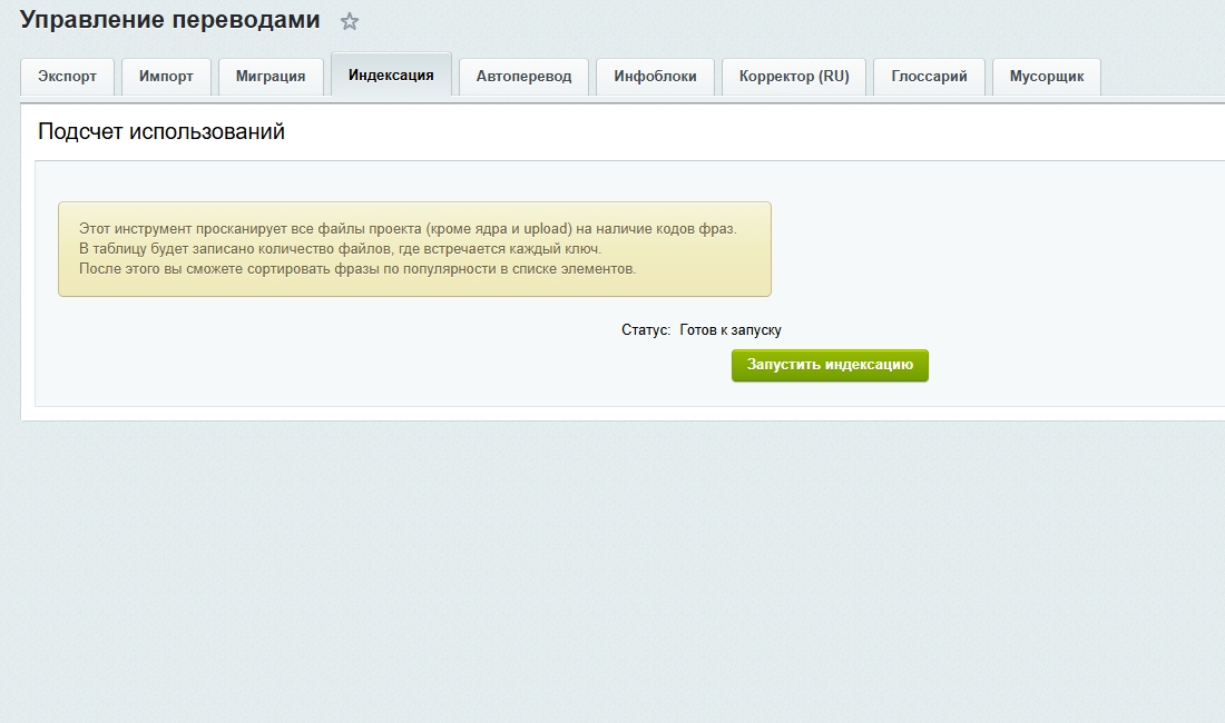 Инструмент пошаговой индексации. Модуль ищет ключи в PHP-файлах проекта и записывает в поле UF_USAGE_COUNT количество использований фразы в коде.
